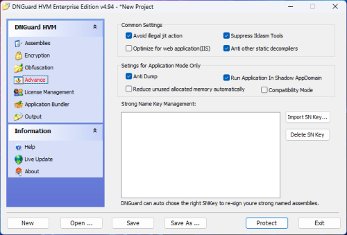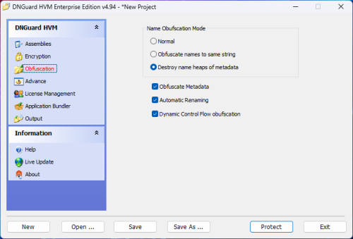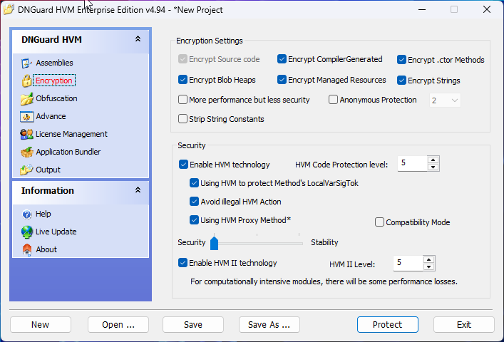 Protected with DNGuard HVM Enterprise. Source code, compiler-generated code, constructors, strings, managed resources, and blob heaps are encrypted. HVM and HVM II are both enabled at level 5, with proxy methods and additional runtime protections. Metadata is obfuscated, name heaps are destroyed, automatic renaming and dynamic control flow obfuscation are enabled, and basic anti-dump and anti-static measures are in place.