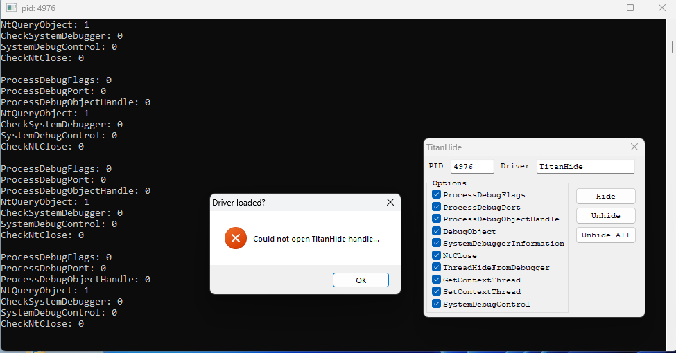 February 9, 201411 yr Coolio and thanks for the update so NtClose [DEADC0DE] works. So the only problem what I now see is with the NtQueryInformationProcess if the InfoClass = 1E value.So if this is called then you get the handle into buffer which is XY.So if this is not 00 in buffer after the API then you get detected by VMProtect = TitanHide failed to run / bypass VMProtect.So I can patch this manually to 00 then your TitanHide does successfully run VMP in Olly 1. So you can also test it with a small script too (dbh,ZwQueryInformationProcess | 7-patch,ZwClose patch if dead,ZwQueryInformationProcess | 1E = ProcessDebugObjectHandle patch) = runs in Olly.Only problem is now that if you close / exit the unpackme then the whole unload process does fail etc but this not happend with your driver if I patch buffer to 00 so unload process does work normaly.Just a info of course if you need to know this maybe. PS: Also thanks again for posting the description image of the hook way. greetz